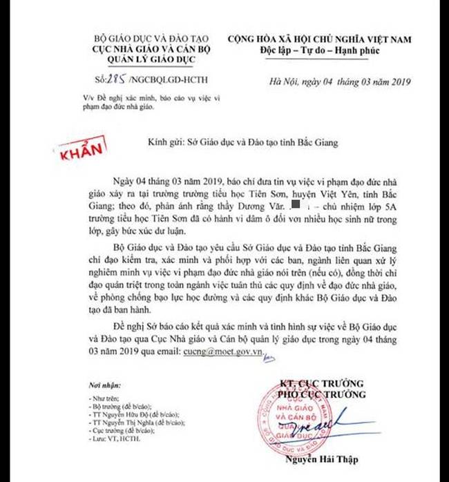Liên quan đến sự việc, ngày 4/3 Bộ GD&ĐT cũng đã có công văn đề nghị địa phương báo cáo vụ việc vi phạm đạo đức nhà giáo