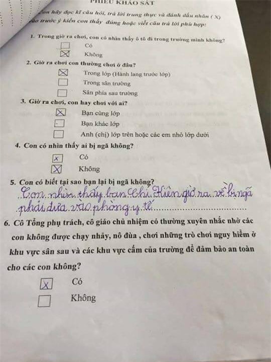 “Khi lấy phiếu khảo sát tới từng lớp thì BGH trường thông báo là làm phiếu khảo sát phục vụ cho công tác thanh tra an toàn trường học vào tháng 3 của phòng chứ giáo viên, học sinh cũng không rõ là khảo sát về vụ việc cháu Kiên” – cô Tú cho biết.