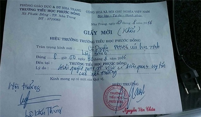 Phụ huynh này còn cho biết thêm, không lâu sau khi đăng clip này lên Facebook thì chiều ngày 29/8, Hiệu trưởng Trường tiểu học Phước Đồng đã có giấy mời lên gặp mặt. Trong giấy mời, ông Nguyễn Văn Châu, Hiệu trưởng trường tiểu học Phước Đồng, có nêu lý do "Giải quyết một số việc có liên quan uy tín của nhà trường".