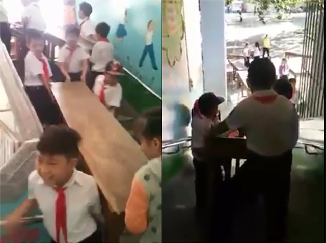Phụ huynh này chia sẻ: "Bàn ghế toàn bằng gỗ, rất nặng. Thế nhưng thầy hiệu trưởng này lại bắt học sinh lớp 4 khiêng từ trên lầu xuống đất. Nhìn các em bước xuống cầu thang như muốn té khiến tôi càng thêm bực và khó chịu. Còn thầy hiệu trưởng Châu thì đứng đó chơi và giơ tay chỉ đạo.