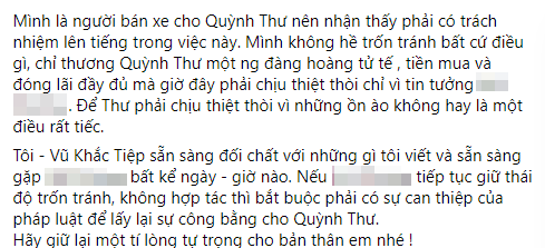 Vũ Khắc Tiệp cho hay, cách đây hơn 2 tháng, Quỳnh Thư muốn bỏ tiền vào ngân hàng để lấy xe ra thì nàng hậu này bỗng nhiên lật mặt, nói đó là xe của công ty mình. "Về phương diện pháp lý, chiếc xe do công ty của.. đứng tên, nhưng người đóng lãi ngân hàng là Quỳnh Thư, có giấy tờ rõ ràng. Bản thân Quỳnh Thư hẹn gặp... nhiều lần nhưng luôn nhận được sự im lặng, không muốn gặp hoặc tìm mọi lý do để né tránh", Vũ Khắc Tiệp chia sẻ.