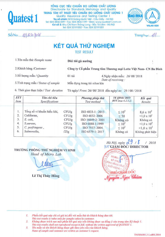 Trong công văn gửi khách hàng cũng có đính kèm kết quả thử nghiệm được thực hiện bởi Trung tâm kỹ thuật tiêu chuẩn đo lường chất lượng 1 trực thuộc Tổng cục tiêu chuẩn đo lường chất lượng cho mẫu lưu của lô hàng. Theo đó, các chỉ tiêu vi sinh vật đều nằm trong giới hạn cho phép, phù hợp với quy định của Bộ Y tế.