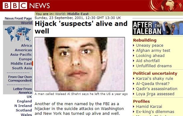 “Waleed al-Shehri là một trong 5 người FBI cáo buộc cố tình điều khiển phi cơ của American Airlines lao vào tòa tháp Trung tâm Thương mại Thế giới. Tuy nhiên, lúc này anh ta đang khẳng định sự vô tội ở Casablanca, Morocco”, BBC đưa tin ngày 23-9-2001.