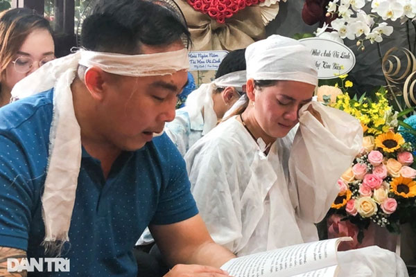 NSƯT Ngọc Huyền và một số đồng nghiệp cũng đến tham dự. Dù có lịch đi diễn ở xa nhưng cả hai vẫn đội khăn tang và nâng niu di ảnh của ba nuôi khiến nhiều người xúc động.