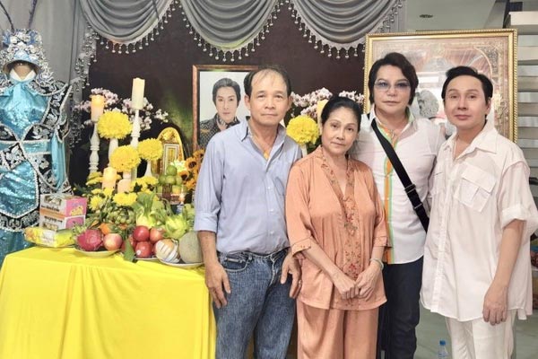 Nghệ sĩ Vũ Luân và Hồng Loan tại lễ cúng 49 ngày của "ông hoàng cải lương" Vũ Linh. Ảnh: @vuluan.