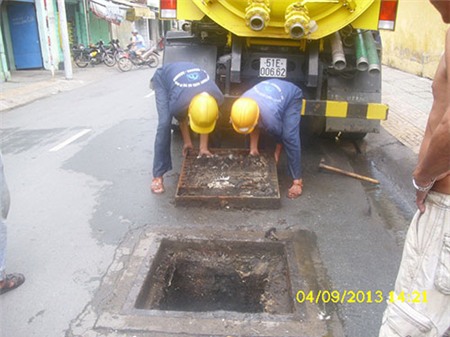 Công nhân Công ty Thoát nước đô thị TP HCM thông cống nghẹt vào chiều 4-9 trên đường Bình Tây, phường 1, quận 6. Ảnh: TÂN TIẾN |