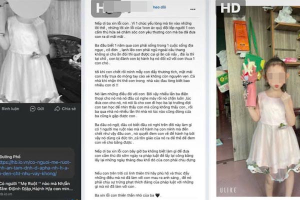 Cùng lúc đó, mạng xã hội Facebook đang chia sẻ thông tin từ bài đăng của một người tên Huỳnh Trung Hiếu. Nội dung đăng tải cho thấy anh và vợ đã ly hôn. Khoảng 1 năm nay, con gái anh sống cùng mẹ, dù nhiều lần muốn gặp con nhưng anh không gặp được. Thời gian này, con gái anh bị đối xử tệ bạc, rồi bị mẹ hành hạ và đã tử vong.