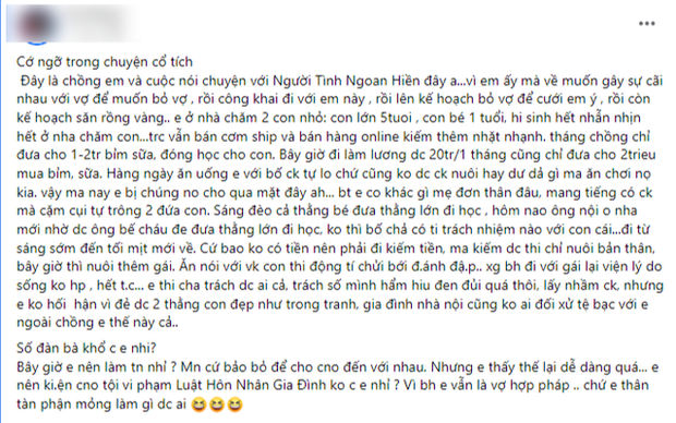 Vụ ngoại tình tréo ngoe mới đây đã trở thành từ khóa nóng nhất mạng xã hội. Drama thu hút rất nhiều sự quan tâm vì những đoạn tin nhắn mùi mẫn được công khai. Theo như những chia sẻ từ người vợ có tên T.P, tổ ấm của cô hiện có 2 đứa con kháu khỉnh, một bé 5 tuổi, một bé 1 tuổi.