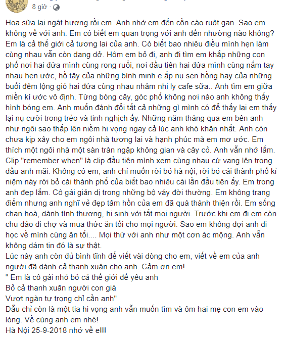 Dẫu chỉ còn là một tia hi vọng anh vẫn muốn tìm và ôm hai mẹ con em vào lòng. Về cùng anh em nhé! Hà Nội 25-9-2018, nhớ về em!!!''.