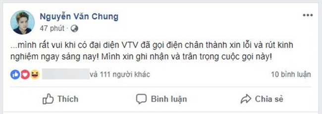 Cũng không chậm trễ, sáng ngày 24/10, VTV đã chính thức gọi điện xin lỗi nhạc sỹ Nguyễn Văn Chung về vấn đề này. Thông báo trên trang cá nhân của mình, nhạc sỹ viết: "Mình rất vui khi có đại diện VTV đã gọi điện chân thành xin lỗi và rút kinh nghiệm ngay sáng nay! Mình xin ghi nhận và trân trọng cuộc gọi này!"