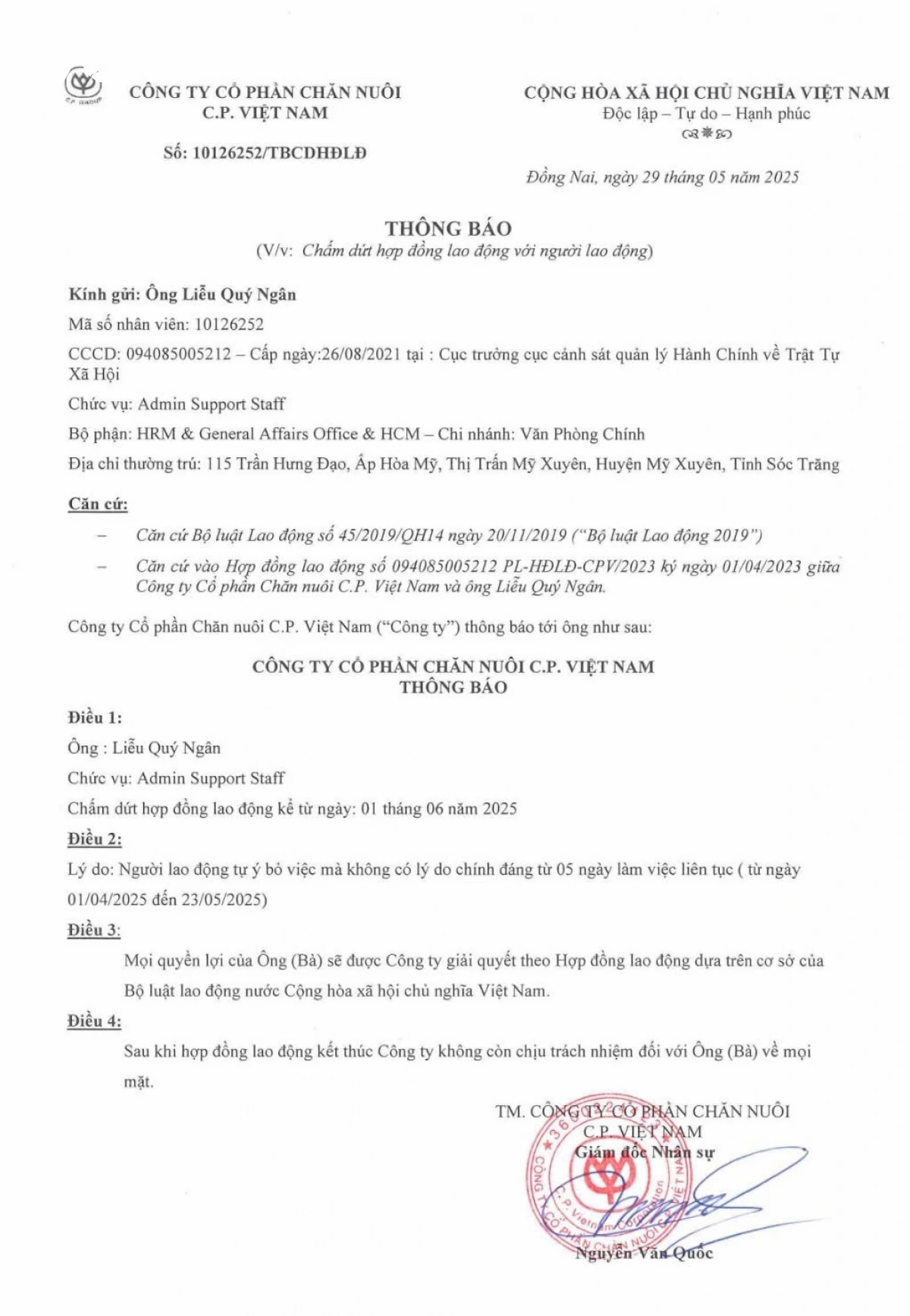Theo nội dung thông báo, thời điểm chấm dứt hợp đồng có hiệu lực kể từ ngày 1/6/2025, với lý do “người lao động tự ý bỏ việc mà không có lý do chính đáng từ 5 ngày làm việc liên tục”, cụ thể là trong khoảng thời gian từ ngày 1/4 đến ngày 23/5/2025.
