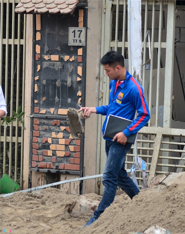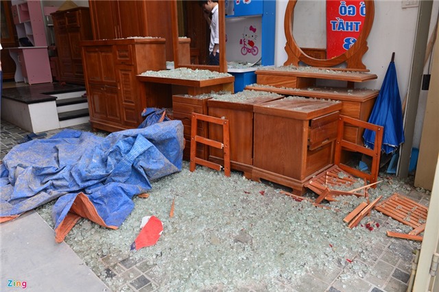 Vẫn chưa hết bàng hoàng, anh Toàn (21 tuổi, trú nhà số 90) cho hay, thời điểm vụ nổ anh ngồi ở quầy tầng một của cửa hàng gạch men, đá ốp. Tiếng nổ tạo ra lực mạnh khủng khiếp đẩy bay cánh cửa sắt trước hiên và nhiều đồ đạc trong nhà anh. Cửa kính vỡ vụn, nhiều vật thể lạ bay xuyên qua cửa sắt trước hiên găm chặt vào tường. |