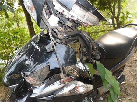 Chiếc xe máy của anh Thương bị hư hỏng khá nặng do thanh sắt văng vào. |