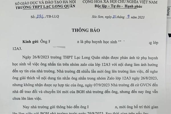 Ngày 25/9, nhà trường gửi thông báo có ghi: "Nay nhà trường gửi thông báo đến ông H., mời ông bố trí thời gian lên làm việc với Ban giám hiệu nhà trường trước ngày 29/9/2023.