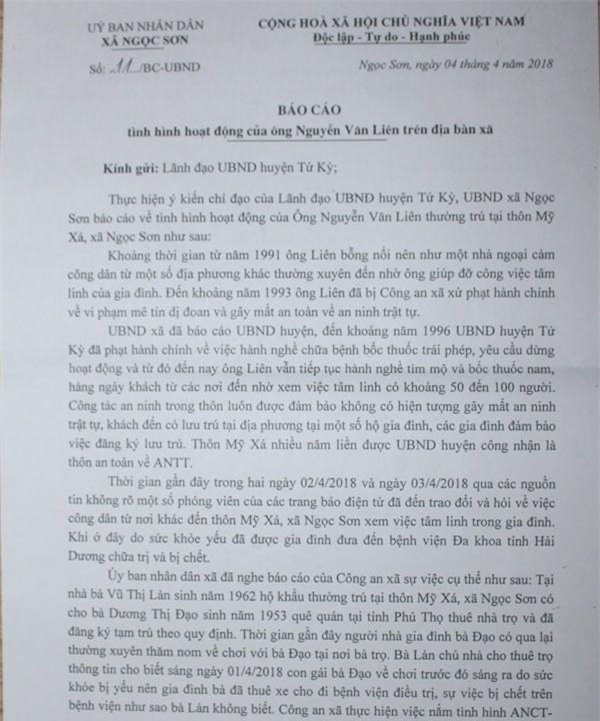 Báo cáo của UBND xã Ngọc Sơn gửi UBND huyện Tứ Kỳ về hoạt động của ông Liên. Ảnh: Đ.Tùy