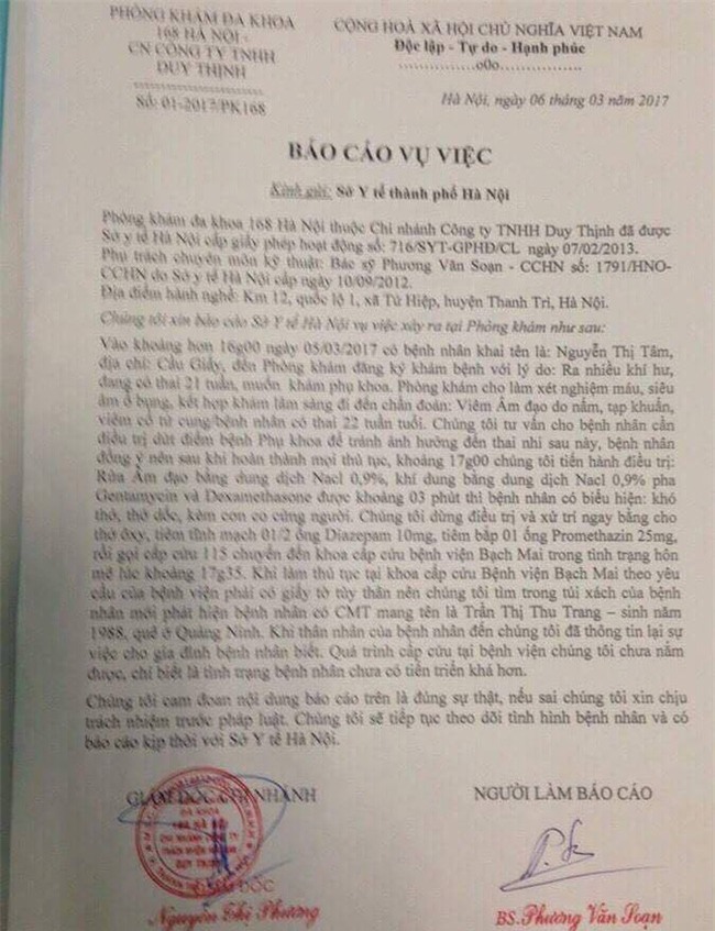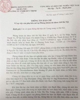 Cùng ngày, phòng khám đa khoa 168 cũng chính thức thông tin về vụ việc. Thông tin cho biết, vào khoảng 16h ngày 5/3/2017, phòng khám có tiếp đón một thai phụ, khai tên là Nguyễn Thị Tâm, địa chỉ: Cầu Giấy đến đăng ký khám với lý do: Ra nhiều khí hư, đang có thai 21 tuần và muốn khám phụ khoa.