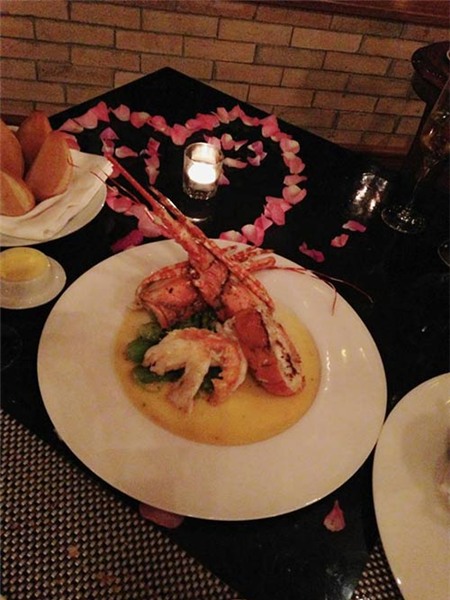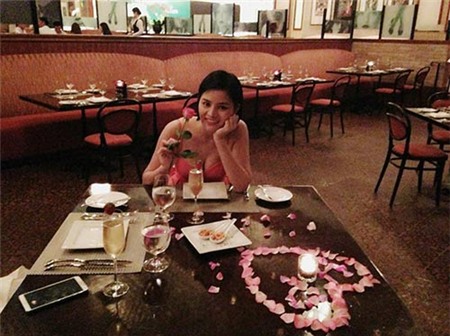 Trong ảnh, Vũ Thu Phương gợi cảm với chiếc đầm dài khoe vòng 1 quyến rũ của "gái một con". Trên bàn ăn là hoa hồng, rượu vang, socola và những dòng chữ ngọt ngào thể hiện tình yêu của hai người.