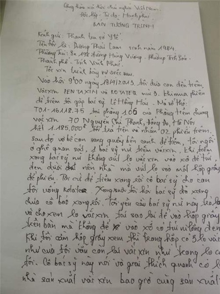 Bản tường trính tố cáo việc tiêm thiếu thuốc của anh Dương Thái Lam