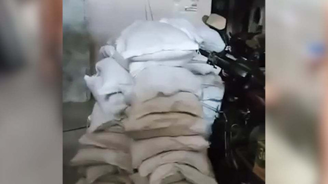 Clip cho thấy, qua khe cửa nhìn vào bên trong có chất hàng chục bao gạo. Có tiếng người dân nói rằng, dân đói mà tổ trưởng giấu gạo mười mấy ngày qua.