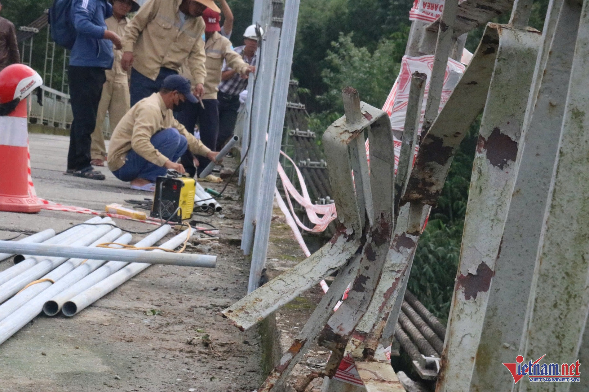 Khoảng 10m lan can cầu bị xe chở rác ủi bay trước khi lao xuống sông. Ảnh: QT