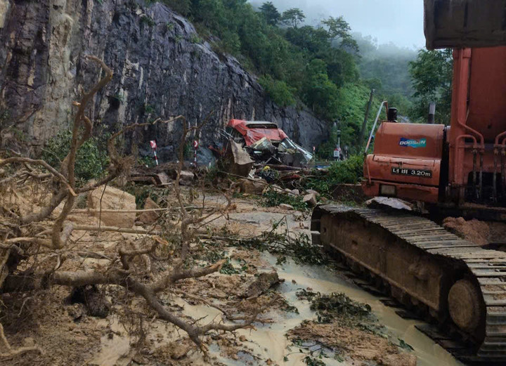 Lúc này, đá tảng lớn và đất cát từ trên núi đổ xuống ô tô khách. Lượng lớn đất đá làm phần cabin ô tô tách rời. Thân xe bị đá từ trên cao làm biến dạng, vỡ kính. Nhiều người mắc kẹt trong xe.