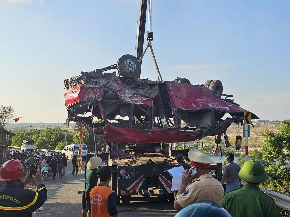 Vị trí xe gặp nạn nằm ven bờ hồ thuộc khu du lịch Bàu Trắng. Tại hiện trường, xe khách mang biển số 86H-045.61 gãy nát. Nhiều lực lượng cứu hộ và xe cứu thương được huy động đến hiện trường.