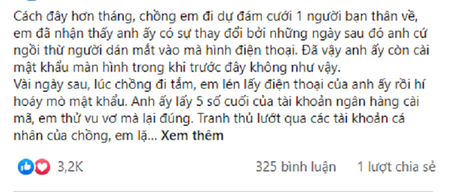 Vài ngày sau, lúc chồng đi tắm, em lén lấy điện thoại của anh ấy rồi hí hoáy mò mật khẩu. Anh ấy lấy 5 số cuối của tài khoản ngân hàng cài mã, em thử vu vơ mà lại đúng. Tranh thủ lướt qua các tài khoản cá nhân của chồng, em lặng người biết được, hôm đi dự đám cưới, chồng mình gặp lại người yêu cũ. Họ về kết bạn facebook với nhau rồi ngày nào cũng chát chít qua lại. Ảnh nào cô ta chia sẻ chồng em cũng vào thả tim khen trẻ khen xinh, sặc mùi thả thính. Anh ấy còn nhắn tin hẹn sẽ mời cô ta đi cà phê, tới quán ngày trước họ hay đến".