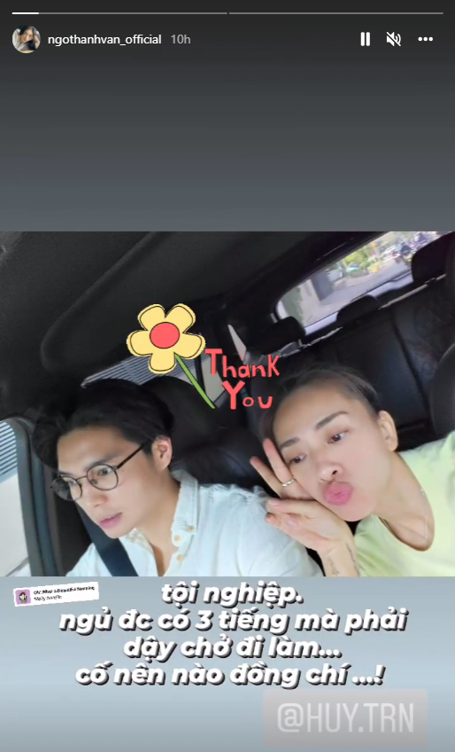 Chưa hết ngưỡng mộ, cư dân mạng lại được dịp cười nghiêng ngả với story "bóc phốt" chồng trẻ mà Ngô Thanh Vân đăng tải lúc cuối ngày. Cụ thể, nữ diễn viên đã chụp bức ảnh Huy Trần đang ngủ say trên xe cùng dòng trạng thái: "Sáng dậy kêu chở đi làm. Đây là cảnh chiều về". Sự dễ thương và hài hước của cặp đôi khiến người hâm mộ phải "rụng tim". Netizen đều vui mừng cho nữ diễn viên, bởi lẽ kể từ khi yêu Huy Trần, Ngô Thanh Vân trở nên tươi tắn vui vẻ hơn hẳn, nụ cười hạnh phúc lúc nào cũng thường trực trên môi.