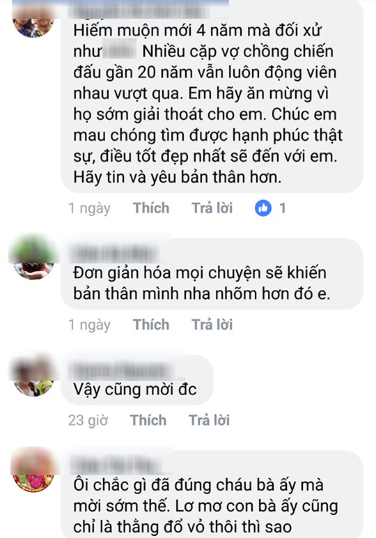 "Hiếm muộn mới có 4 năm mà đối xử với nhau không ra gì. Em hãy mừng vì họ sớm giải thoát cho em. Chúc em mau chóng tìm được hạnh phúc thật sự, điều tốt đẹp nhất sẽ đến với em. Hãy tin và yêu bản thân hơn" – chị Nguyễn Hồ Ánh Vân chia sẻ.