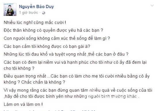 Khi bị nhiều người 'ném đá' là quá dễ dàng trong chuyện yêu đương thì Bảo Duy lên tiếng: "Nhiều lúc nghĩ cũng mắc cười! Độc thân không có quyền được yêu hả các bạn? Con người sống không cảm xúc thế sống để làm gì?