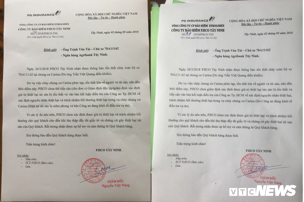 Ở văn bản thứ 2, PJICO cho biết: “Do vụ việc cháy chung cư Carina phức tạp, tổn thất lớn về người và tài sản, nên đến thời điểm này PJICO chưa giám định, xác định được giá trị thiệt hại tài sản bị tổn thất và tiếp cận được văn bản kết luận điều tra của Công an TP.HCM về xác định nguyên nhân thiệt hại và trách nhiệm bồi thường thiệt hại trong vụ cháy chung cư Carina (do công an đang khởi tố điều tra vụ án)”.