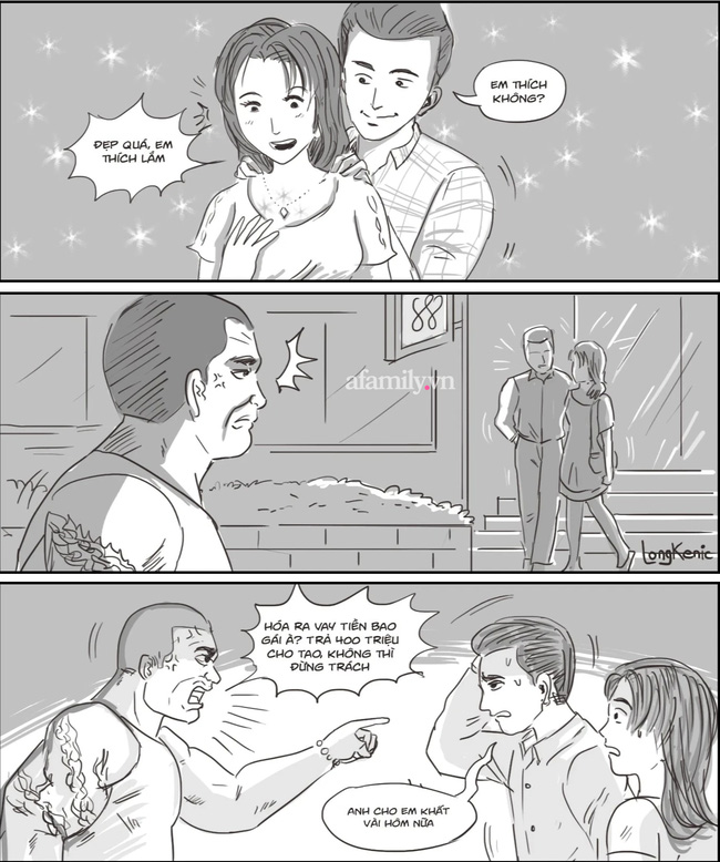 Rồi một gã đàn ông nhìn sang tôi. Thấy tôi đang ngơ ngác, gã ta cười khẩy nói: "Hóa ra vay tiền để bao gái. Cô em xinh đẹp thế này, bảo sao nó không vay nợ tới mấy trăm triệu. Liệu mà trả tiền cho thằng này, không thì đừng trách...".