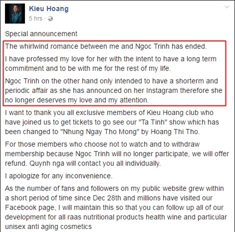 Tỷ phú Hoàng Kiều thông báo chính thức chia tay Ngọc Trinh, cùng với đó,