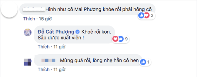 Đồng thời, trong một bình luận trả lời khán giả về tình trạng sức khỏe của nữ diễn viên "Những thiên thần áo trắng", Cát Phượng cập nhật nhanh tin mừng đến mọi người: "Khỏe rồi con. Sắp được xuất viện".