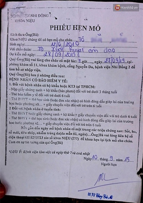 Giấy hẹn mổ trước đó mà Bệnh viện Nhi Đồng 2 đã cung cấp cho anh T. |