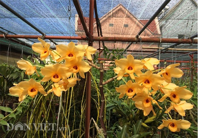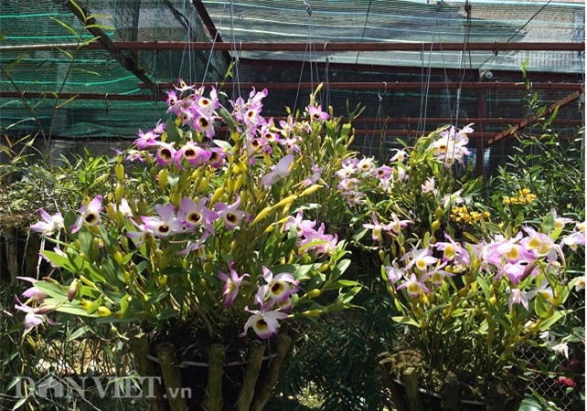 Ba giò lan ý ngọc nở rộ được ông Phạm Quang Bình treo ở một góc trong vườn, việc bố trí các giò lan trong vườn hợp lý khiến ai vào tham quan vườn của ông bình đi đâu cũng thấy hoa.