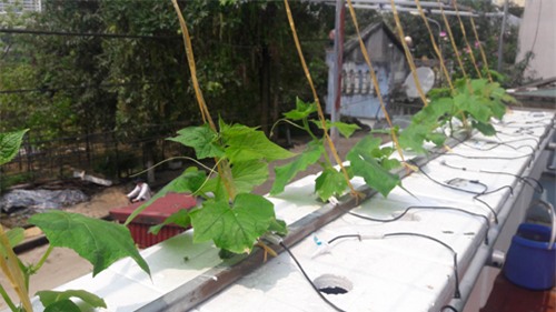 Anh cho biết, khoảng sân thượng và ban công tầng 2 của gia đình rộng chừng 40m2. Nhưng với phương pháp thủy canh, anh có thể trồng được nhiều loại rau củ như cà chua, cải xoong Nhật, xà lách, rau thơm và các loại cây dây leo như bầu, bí, mướp, dưa chuột,…