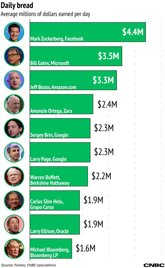 Đứng ngay sau Mark Zuckerberg là Bill Gates với vị thế là người giàu nhất thế giới từ nhiều năm nay. Ở tuổi 60, tính trung bình mỗi ngày ông chủ Microsoft kiếm được 3,5 triệu USD. Kế sau là CEO Amazon Jeff Bezos 52 tuổi, kiếm được 3,3 triệu USD/ngày. Họ là 3 người duy nhất trong danh sách kiếm được hơn 3 triệu USD cho mỗi ngày của cuộc sống.