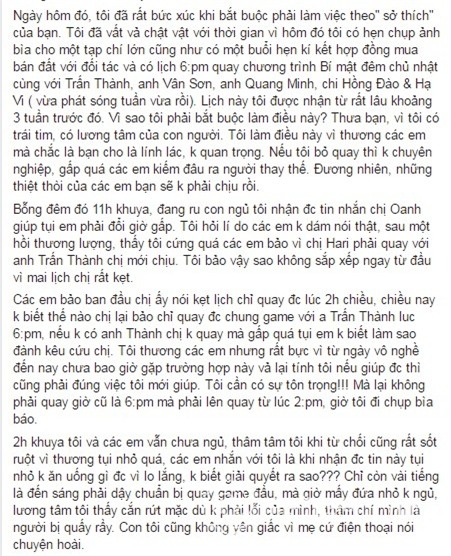 Các em bảo ban đầu chị ấy nói kẹt lịch chỉ quay được lúc 2h chiều, chiều nay không biết thế nào chị lại bảo chỉ quay được chung game với anh Trấn Thành lúc 6:pm, nếu không có anh Thành chị không quay mà gấp quá tụi em không biết làm sao đành kêu cứu chị. Tôi thương các em nhưng rất bực vì từ ngày vô nghề đến nay chưa bao giờ gặp trường hợp này vả lại tính tôi nếu giúp được thì cũng phải đúng việc tôi mới giúp. Tôi cần có sự tôn trọng! Mà lại không phải quay giờ cũ là 6:pm mà phải lên quay từ lúc 2:pm, giờ tôi đi chụp bìa báo.