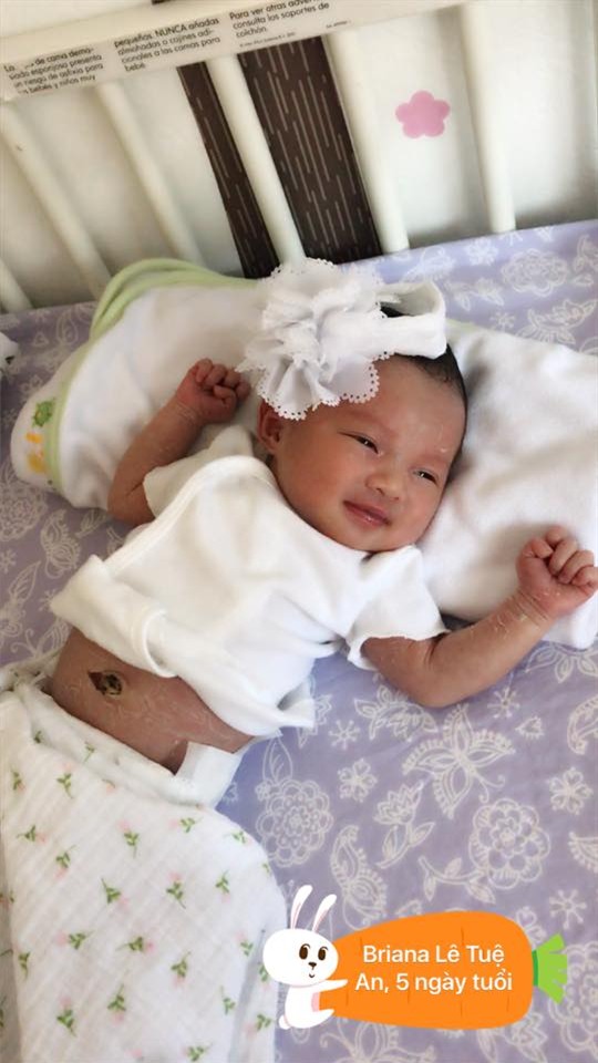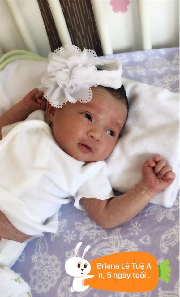 Sau 5 ngày lâm bồn, Vy Oanh mới đây đã công khai hình ảnh con gái mới sinh. Theo bật mí của nữ ca sĩ, nhóc tỳ được bố mẹ đặt tên tiếng Việt là Tuệ An, tiếng Anh là Briana. Sau 5 ngày chào đời, con gái Vy Oanh đang lột da và bắt đầu rụng rốn.