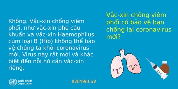 WHO: Không. Vắc-xin chống viêm phổi, như vắc-xin phế cầu khuẩn và vắc-xin Haemophilus cúm loại B (Hib) không thể bảo vệ chúng ta khỏi coronavirus mới.