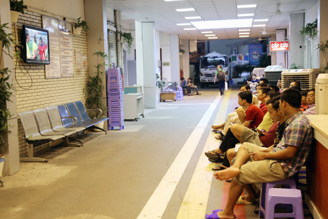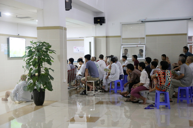 Chiếc tivi chiếu bóng đá ở ngay lối vào thu hút các bệnh nhân cũng như người nhà ngồi xem chật kín dãy ghế.