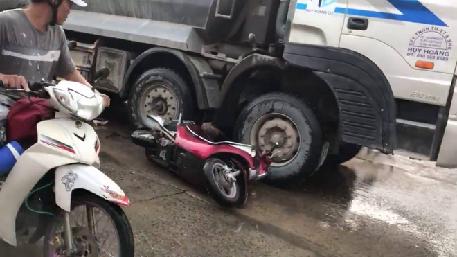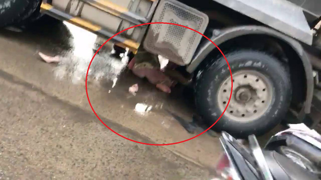 Trong lúc chạy nhanh, phanh gấp để tránh xe phía trước, xe máy của 2 người này bị đổ xuống đường và cuốn vào gầm xe tải cùng chiều.