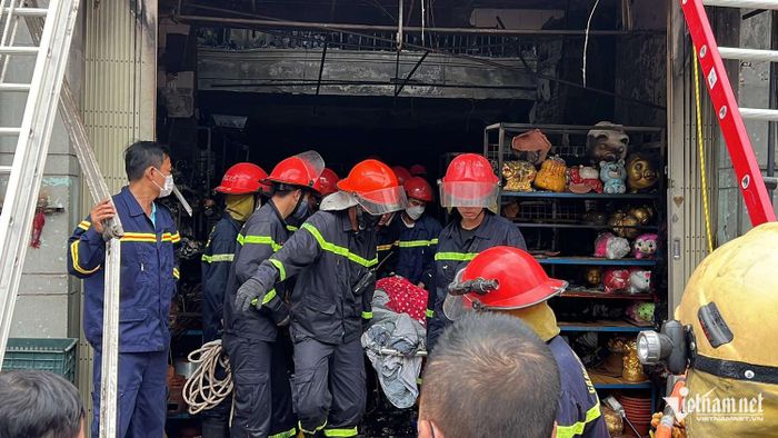 Lực lượng chức năng đưa nạn nhân ra khỏi hiện trường vụ cháy. Ảnh: Xuân Ngọc