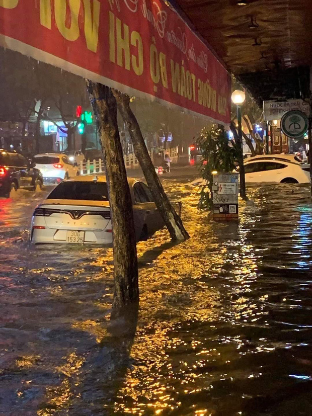 Cả tuyến phố mênh mông biển nước, một chiếc ô tô mắc kẹt trên phố