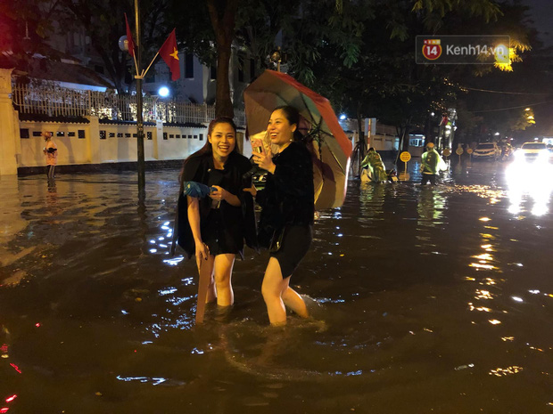 Dù mưa gió nhưng nhiều người vẫn tỏ ra thích thú, vui vẻ dù ngập sâu