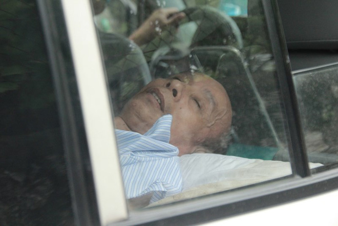 Bị cáo Hùng nằm trên cáng, tỏ ra mệt mỏi.