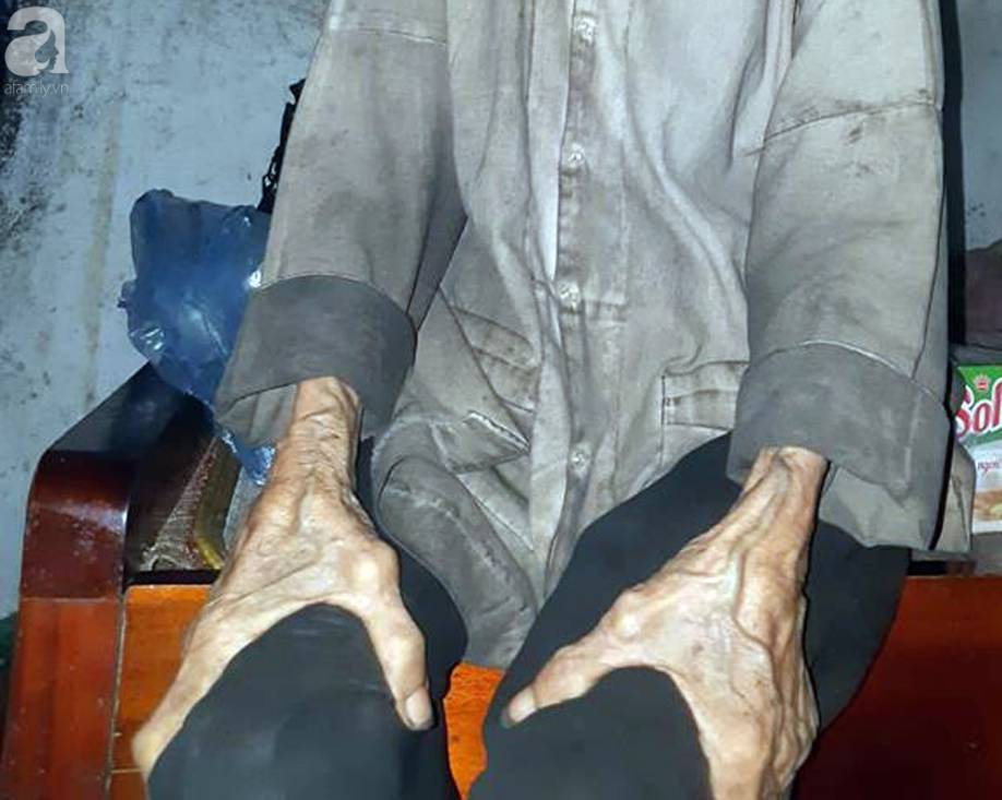 Đôi bàn tay gầy gò và bộ quần áo dường như rất lâu rồi chưa được giặt giũ.