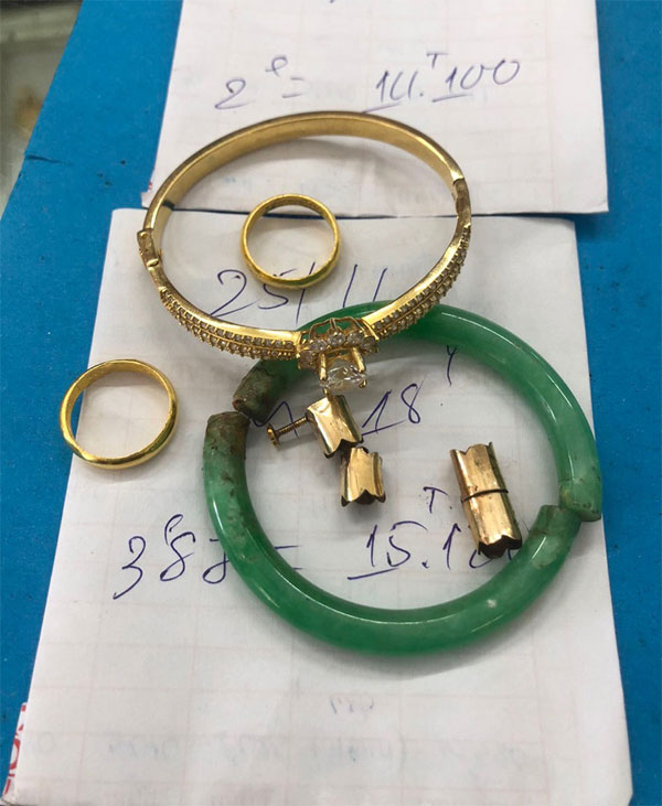Khám xét nơi ở của Trâm, cơ quan công an thu giữ 3 nhẫn vàng, 1 dây chuyền vàng, 1 xe gắn máy, 25 triệu đồng và những tang vật khác.