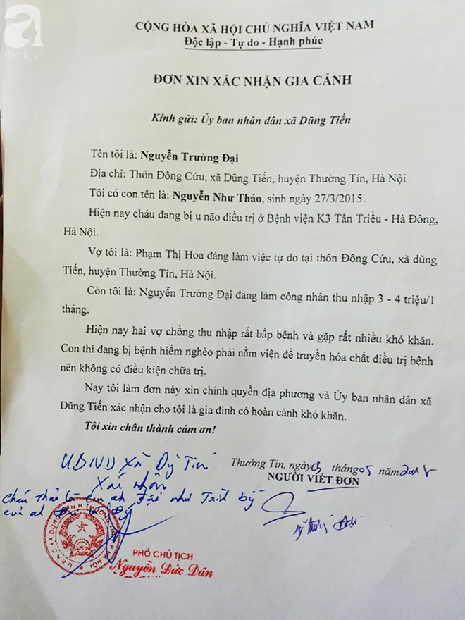 Ông Nguyễn Đức Dân (Phó chủ tịch UBND xã Dũng Tiến) xác nhận gia đình anh Đại, chị Hoa gặp hoàn cảnh vô cùng khó khăn khi bé Thảo bị bệnh hiểm nghèo, phải truyền hóa chất. Hai vợ chồng lại chỉ có thu nhập bấp bênh tháng chỉ 3-4 triệu đồng.